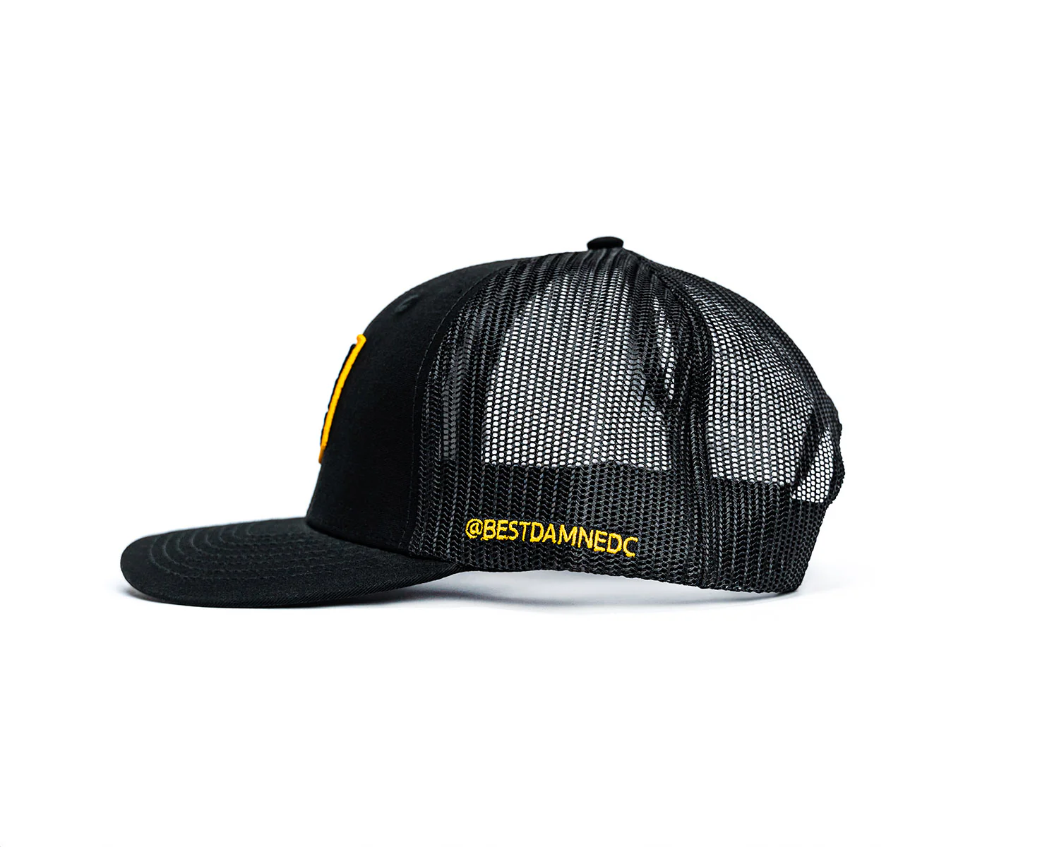 At long last, the Best Damn EDC hat I’ve been wearing in my videos for nearly two years now is available for purchase. It features a big, bold, vintage-inspired Best Damn EDC logo in gold 3D puff embroidery on a black mesh back hat with added gold embroidered letters on one side as well.